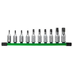 Our 10PC 3/8" Drive TORX Bit Socket Set with FOUR FLAT™ sides is designed from the ground up to be part of the most versatile socket family. Milwaukee® bit sockets feature an innovative design with four parallel flat sides, which deter rolling and are wrench-compatible. This also creates a slim profile to provide the best access in tight spaces. The one-piece socket design offers improved durability compared to two-piece designs by eliminating the risk of the bit separating from the socket base. This set includes a storage rail for better organization. Laser engraved size markings provide easy identification and chrome plating offers rust and corrosion protection. All Milwaukee® bit sockets are backed by a Lifetime Guarantee.