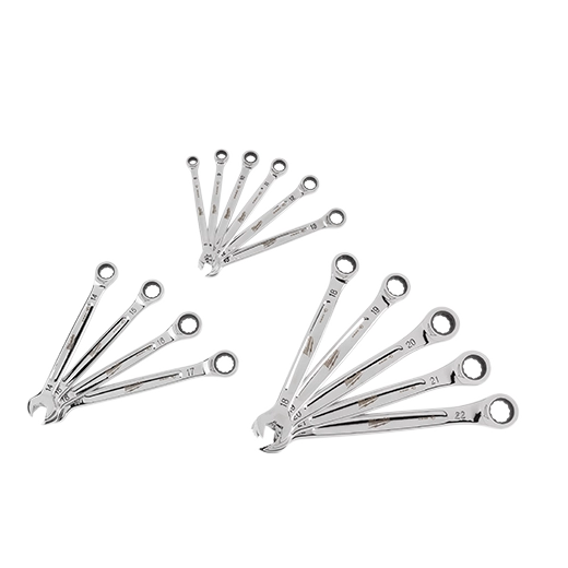 Nos clés mixtes à cliquet offrent un arc de débattement de 2,5° afin de permettre à nos utilisateurs de travailler rapidement et efficacement dans les endroits exigus. Nos clés de mécanicien sont munies de robustes cliquets doubles superposés de nos mécanismes offrant la plus longue durée de vie des cliquets et un accès amélioré grâce à 144 positions d’encliquetage. La fourche MAX BITEMC améliore la prise de la clé à cliquet sur les écrous et les boulons et offre 25 % pus de couple que les clés à surface lisse. Chaque clé mixte comporte une conception de manche en poutre en I confortable pour une ergonomie supérieure. Notre jeu de clés mixtes à cliquet est muni d’incrustations de taille remplies d’encre pour faciliter l’identification, ainsi que la rapidité de distinction entre les clés SAE et métriques. Le jeu de clés mixtes à cliquet métrique de 15 morceaux comprend un plateau conçu pour les tiroirs de rangement en acier afin de faciliter le rangement efficace sans espace perdu. Nous appuyons nos produits avec une garantie à vie sur tous nos jeux de clés mixtes à cliquet.