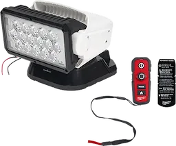 Notre phare de recherche télécommandé pour services publics M18MC permet aux travailleurs des services publics d’électricité de trouver des points précis sur les lignes de transmission ou d’éclairer des champs entiers jusqu’à une distance de 1 250 verges. Cette lampe sans fil produit un éclairage à haute définition TRUEVIEW allant jusqu’à 4 250 lumens et s’adapte pour fournir un éclairage à faisceau spot ou flood. Elle comprend aussi une télécommande sans fil préjumelée qui permet de changer l’orientation et le faisceau et de la mettre en marche à distance. Cette lampe est également compatible avec ONE-KEYMC afin de pouvoir la commander à partir de l’appli en ligne ONE-KEYMC. Le phare de recherche télécommandé pour services publics MILWAUKEEMD résiste aux intempéries pour l’utilisation à l’extérieur. Cette lampe est couverte par une garantie de 5 ans sur l’outil et une garantie à vie limitée sur les DEL qui n’auront jamais besoin d’être remplacées.