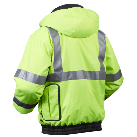 Milwaukee® M12™ High Visibility Heated Jacket: Powered by M12™ REDLITHIUM™ Battery Technology, Milwaukee® M12™ Heated Jackets integrate (3) carbon fiber heating elements and advanced fabric-layering technology to distribute and maintain heat across core body areas. A 300-denier, wind and water resistant shell keeps weather out while improved insulation and a thermal fleece lining hold heat in to maximize warmth and reduce the number of layers needed. Featuring 3M™ Scotchlite™ reflective striping and a zip-on hood for added jobsite versatility, the Jacket meets ANSI/ISEA 107-2010 Class 3 certification.