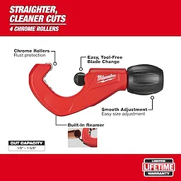 Le coupe-tube à action continue pour le cuivre Milwaukee de 1 1/2 po est conçu pour produire des coupes nettes et droites. Une conception à 4 galets produit des coupes exactes et empêche la déviation. Pour une durabilité accrue et un rendement supérieur, des galets chromés procurent la meilleure protection contre la rouille dans la catégorie. Un alésoir intégré permet l’ébarbage rapide et simple.