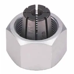Complete 1/4" collet and locking nut assembly for use with Milwaukee routers (series 5615, 5616, 5619, and 5625). For use with 1/4" shank router bits, the assembly includes a premium 1/4" collet with self-release feature that prevents bits from jamming in the assembly. The collet's extra-long, 8-segment design ensures maximum bit to collet surface contact to minimize vibration and runout. The precision ground locking nut features extra wide faces to ensure a firm, reliable nut-to-wrench connection. Includes 1/4" collet and locking nut.
