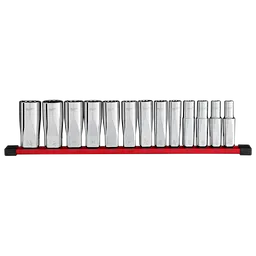 Notre ensemble de douilles à puit profond SAE, 1/2 pièces à 12 points de 13 pièces et côtés FOUR FLATMC est conçu dès le départ pour faire partie de la famille de douilles la plus polyvalente. Les douilles Milwaukee présentent une conception innovante avec quatre côtés plats parallèles, qui empêchent le roulement et sont compatibles avec les clés. La taille est gravée au laser facilitant l'identification et le chrome offre une protection contre la rouille et la corrosion. Ce jeu comprend un rail de rangement pour une meilleure organisation. Tous les embouts MilwaukeeMD sont couverts par une garantie à vie limitée.
