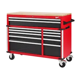 Notre grande capacité 52 po L’établi mobile à 12 tiroirs combine la mobilité, la fonction et le rangement des outils dans une seule boîte à outils. Le plateau réversible en bois massif de 1,2 po d'épaisseur est recouvert de polyuréthane sur les six côtés pour une protection accrue. La surface de travail a une profondeur de 22 po pour offrir un vaste espace de travail et une hauteur de 41,3 po pour une position debout plus ergonomique. L'armoire à outils est soudée avec un corps en acier de calibre 18 au-dessus d'un cadre de base en cornière de calibre 6 pour une capacité de charge de 2 500 lb. Les glissières de tiroirs à roulements à billes, à fermeture douce, d'une capacité de 120 lb, empêchent les tiroirs de s'ouvrir ou de se refermer accidentellement. L'armoire de l'établi portable comporte des tiroirs de différentes largeurs et hauteurs pour un rangement optimal des outils et accessoires de toutes tailles, avec un espace de rangement de 23 543 po³ Le tiroir supérieur pleine largeur est renforcé par une double paire de glissières à fermeture souple de 120 lb et est suffisamment haut pour y ranger des douilles à impact profond. Vous apprécierez la commodité d'un centre d'alimentation intégré à 6 prises avec des ports USB pour recharger vos batteries et vos appareils électroniques. Il y a même de la place pour monter des chargeurs de batterie MILWAUKEEMD sur la paroi latérale comme solution de stockage optimisée.