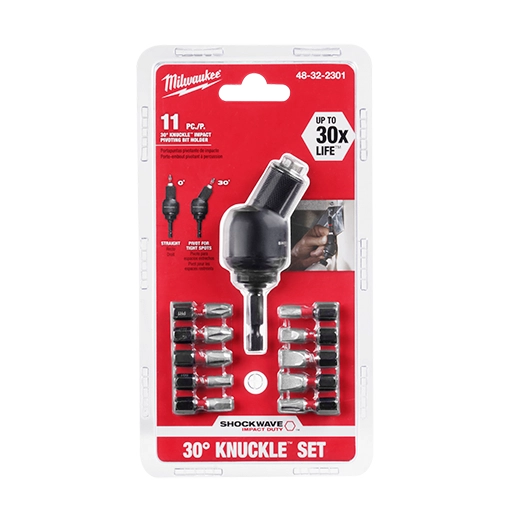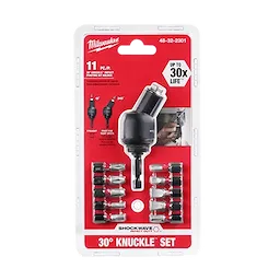 Notre jeu de porte-embout pivotant de SHOCKWAVEMC 30° KnuckleMC de 11 pièces vous permet de visser des fixations ou de percer des trous dans les espaces restreints et difficiles d’accès. Cette conception innovante et compacte se verrouille à 0° ou à un angle 30° et est conçue pour fonctionner avec les accessoires à prise hexagonale de 1/4 po MILWAUKEEMD SHOCKWAVEMC Impact DutyMC. Le jeu de rotule à 30 degrés Milwaukee est coté pour le couple atteignant 2 000 po-lb produit par les visseuses à chocs. La rotule de 30° KnuckleMC est conçue avec la technologie SHOCKWAVEMC Impact DutyMC fabriquée pour une robustesse extrême et une durée de vie jusqu’à 30X plus longue. Ce porte-embout aimanté Milwaukee est fabriqué avec un acier exclusif et thermotraité pour contrôler la dureté. Les embouts à insérer SHOCKWAVEMC Impact DutyMC présentent une géométrie de conception novatrice avec une zone d’absorption d’énergie pour prolonger leur durée de vie.