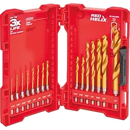 Milwaukee® SHOCKWAVE™ Impact Duty Titanium Drill Bits with RED HELIX™ are engineered for impacts and drills. Designed with a Variable Helix ™ with an aggressive 35° Helix Angle which ends at 15°, the Impact Duty Titanium Drill bits with RED HELIX™ provide Rapid Chip Removal™ to limit heat buildup to Stay Sharper Longer™. The 135° split point tip delivers a precision start and prevents walking for fast, accurate holes. Titanium coating can be used in all drilling applications to give you up to 3X life vs. Black Oxide Drill Bits™.
