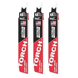 Notre lame SAWZALLMD The TORCHMC avec NITRUS CARBIDEMC pour la fonte et les autres métaux épais représente la nouvelle génération de technologie de dents au carbure. Cette lame SAWZALLMD avec dents au NITRUS CARBIDEMC vous permet de couper plus longtemps, plus de matériaux et plus rapidement que les produits à dents au carbure classiques sur le marché aujourd’hui. La technologie MILWAUKEEMD NITRUS CARBIDEMC élimine le compromis entre la durée de vie et la rapidité de coupe en comparaison aux lames à dents au carbure ordinaires. La lame procure une durée de vie 3X plus longue que les lames de scie alternative à dents au carbure existantes afin de pouvoir continuellement couper les tuyaux de fonte les plus exigeants. Fabriquées avec 25 % plus de carbure nitreux par dent et une languette universelle de 1/2 po, la lame SAWZALLMD The TORCHMC avec NITRUS CARBIDEMC est conçue pour couper les métaux les plus épais comme la fonte et les tuyaux d’évacuation. Grâce à son carbure unique, elle surpasse aussi les lames à dents au carbure ordinaire dans les métaux épais courants.