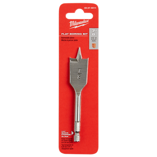 Nos mèches plates MILWAUKEEMD sont la solution parfaite pour le perçage de trou à n’importe quel angle dans un éventail de matériaux. Notre foret à trois pointes de qualité supérieure est fabriqué en acier à haute teneur en carbone thermotraité. Nous avons conçu la pointe guide et le tranchant de ce foret plat de manière à pouvoir le réaffûter et vous faire épargner du temps tout en prolongeant la durée de vie du foret. Notre foret à trois pointes de 7/8 x 4,5 po perce des trous nettement et rapidement à n’importe quel angle dans le bois, le plastique, le contreplaqué et le Formica.