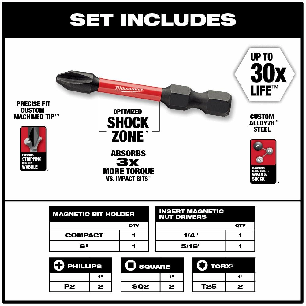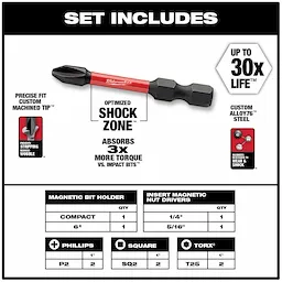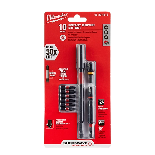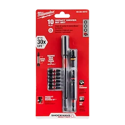 Milwaukee SHOCKWAVE™ Impact Duty driver bits are engineered to be the most durable, best fitting driver bits on the market. The optimized Shock Zone geometry is unique for each tip type to provide up to 30X longer life and absorbs 3X more torque versus other impact bits. SHOCKWAVE™ driver bits are built to deliver extreme durability for the most demanding applications. SHOCKWAVE™ Impact Duty driver bits can be used in impact drivers or drill drivers.