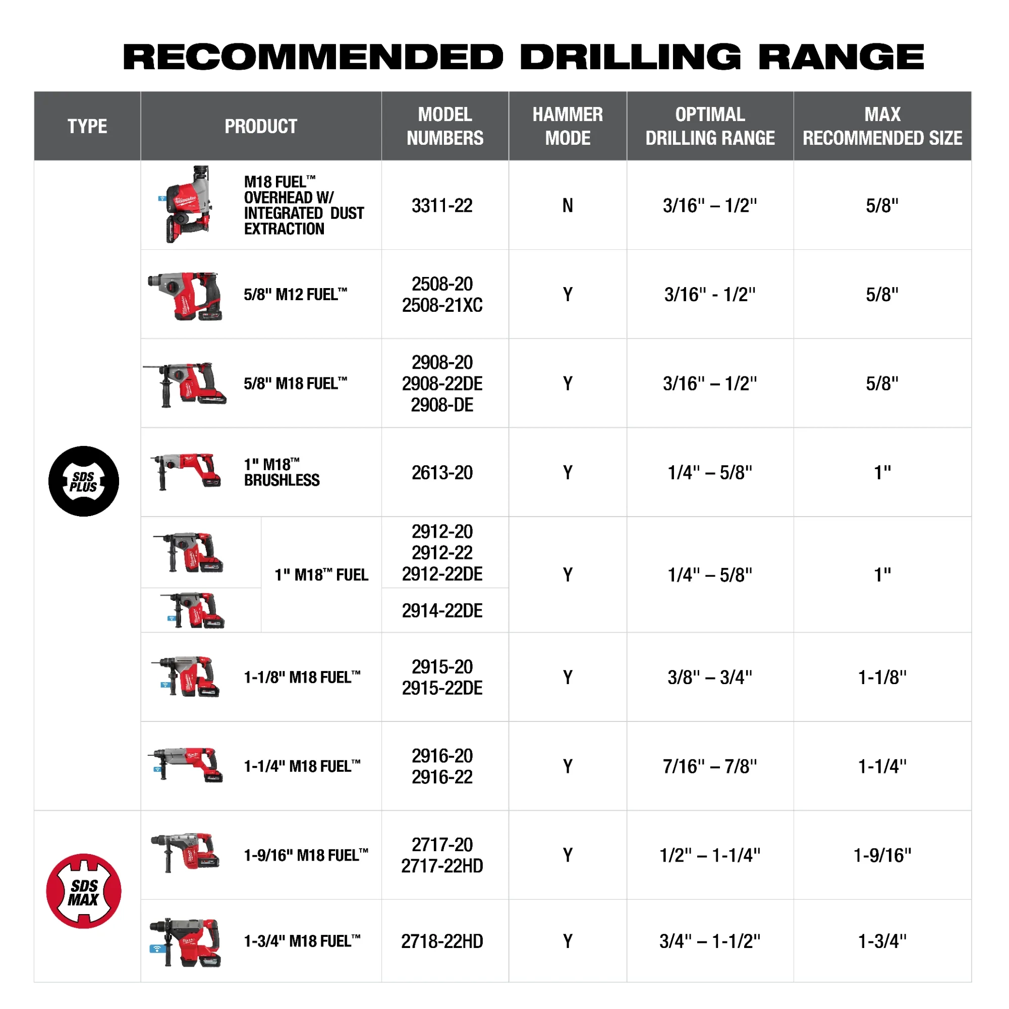 M18MC est la première plateforme de batteries au monde à offrir une gamme complète de marteaux rotatifs de SDS Plus à SDS Max fonctionnant tous sur la même batterie. M18 FUELMC est conçu pour les personnes de métier les plus exigeantes au monde. Offrant des performances inégalées dans une structure compacte, tous les produits M18 FUELMC sont dotés de trois innovations exclusives à Milwaukee® - le moteur sans balais POWERSTATEMC, le bloc-batterie REDLITHIUMMC et le matériel et le logiciel d'intelligence REDLINK PLUSMC qui offrent une puissance, une autonomie et une durabilité inégalées. En d’autres mots, la gamme de marteaux rotatifs sans fil MILWAUKEE® M18 FUELMC offre la meilleure combinaison de puissance et d'autonomie, le tout sur la plateforme de batterie M18MC REDLITHIUMMC.SDS Plus