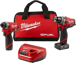 The 2598-22 M12 FUEL 2-Tool Combo Kit is the Most Capable and Most Compact 12-Volt Hammer Drill Driver and Impact Driver Combo Kit on the market. Included is the M12 FUEL Hammer Drill Driver (2504-20), the Most Capable, Lightest Weight and Most Compact 12-Volt Hammer Drill Driver in the market. At only 6.6 and 2.8 lbs. of weight it is the best Hammer Drill Driver to use in compact spaces. It delivers the power to do a wide variety of applications at 1700 RPMs and 350 in./lbs. of torque. Also included, the M12 FUEL Hex Impact (2553-20), the Fastest Driving Speed, Most Compact with 4- Mode Drive Control Impact Driver in the market. At 3,300 RPM the impact drives screws over 20% faster than competitors. At 5.1 in. L it allows for unmatched access in tight spaces. The 4-Mode DRIVE CONTROL provides greater control over output speed and power for greater versatility by delivering 0-1,300 RPM in Mode 1, 0-2,400 RPM in Mode 2 and 0-3,300 RPM in Mode 3. Mode 4 is Self-Tapping Screw Mode which is designed to reduce walking when starting self-tapping screws as well as reduce overdriving, breaking and stripping out screws.