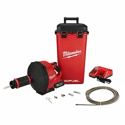 Our M18 FUEL™ Drain Snake with CABLE DRIVE™ Locking Feed System represents the next level in performance for handheld machines and is the first to bring brushless motor technology to the drain cleaning industry. The POWERSTATE™ Brushless Motor provides more clearing power than corded competitors for tough jobs through 3 inch drain lines. REDLINK PLUS™ Intelligence ensures maximum performance under load and improves control throughout the entire process. The REDLITHIUM™ battery pack powers through multiple jobs on a single charge, delivering cordless mobility, safety, and power supply to the drain cleaning industry. MILWAUKEE® CABLE DRIVE™ Locking Feed System maintains the selected feed speed, and its twist lock design auto-adjusts to all compatible cable sizes, giving you the best cable grip when feeding and working the clog. Our drain snake is the professional solution for unclogging sinks, bathtubs, showers and more. M18 FUEL™ Drain Snake has a fully enclosed drum to ensure you get the best protection and mess containment. This kit includes a 5 Piece Small Cable Head Attachment Kit with RUST GUARD™ Plating, a ¼” X 35’ Inner Core Bulb Head Cable with RUST GUARD™ Plating, a ⅜” X 35’ Inner Core Coupling Cable with RUST GUARD™ Plating, an M18™ REDLITHIUM™ XC 5.0 Battery Pack, an M18™ & M12™ Multi-Voltage Charger, and a storage bucket.