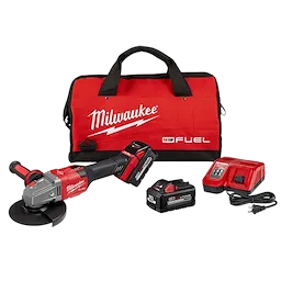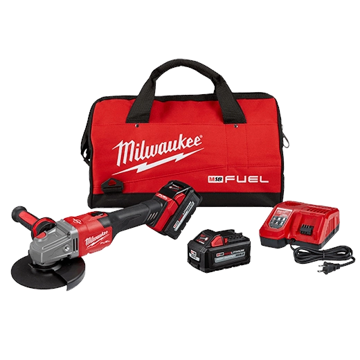 Our M18 FUEL™ 4-1/2” - 6” Braking Grinder, Slide Switch, Lock-On two battery kit is our highest performing small angle grinder. It generates the power of a 13A corded grinder, brakes all accessories under 3 seconds, and has 6” grinding capacity. The POWERSTATE™ Brushless Motor provides you with 9,000 RPM and the power equivalent of a 13A corded grinder, delivering industry-leading performance. REDLINK PLUS™ Intelligence ensures maximum performance and protects your angle grinder from overload, overheating and over discharge. The Rapid Stop Brake feature stops all accessories in under 3 seconds. Providing you with high performance, advanced ergonomics and legendary durability, the M18 FUEL™ 4-1/2” - 6” Braking Grinder is designed to complete the toughest grinding, surface preparation and cutting applications with all 4-1/2” – 6” accessories. The M18™ REDLITHIUM™ HIGH OUTPUT™ XC6.0 Battery provides you with more material removed per charge and unmatched run-time in all applications. Tool-free accessory changes using the FIXTEC nut and tool-free guard adjustments mean you will experience less downtime as you work. The cordless angle grinder's grinding wheel is sold separately. The kit includes two M18™ REDLITHIUM™ HIGH OUTPUT™ XC6.0 Batteries.
