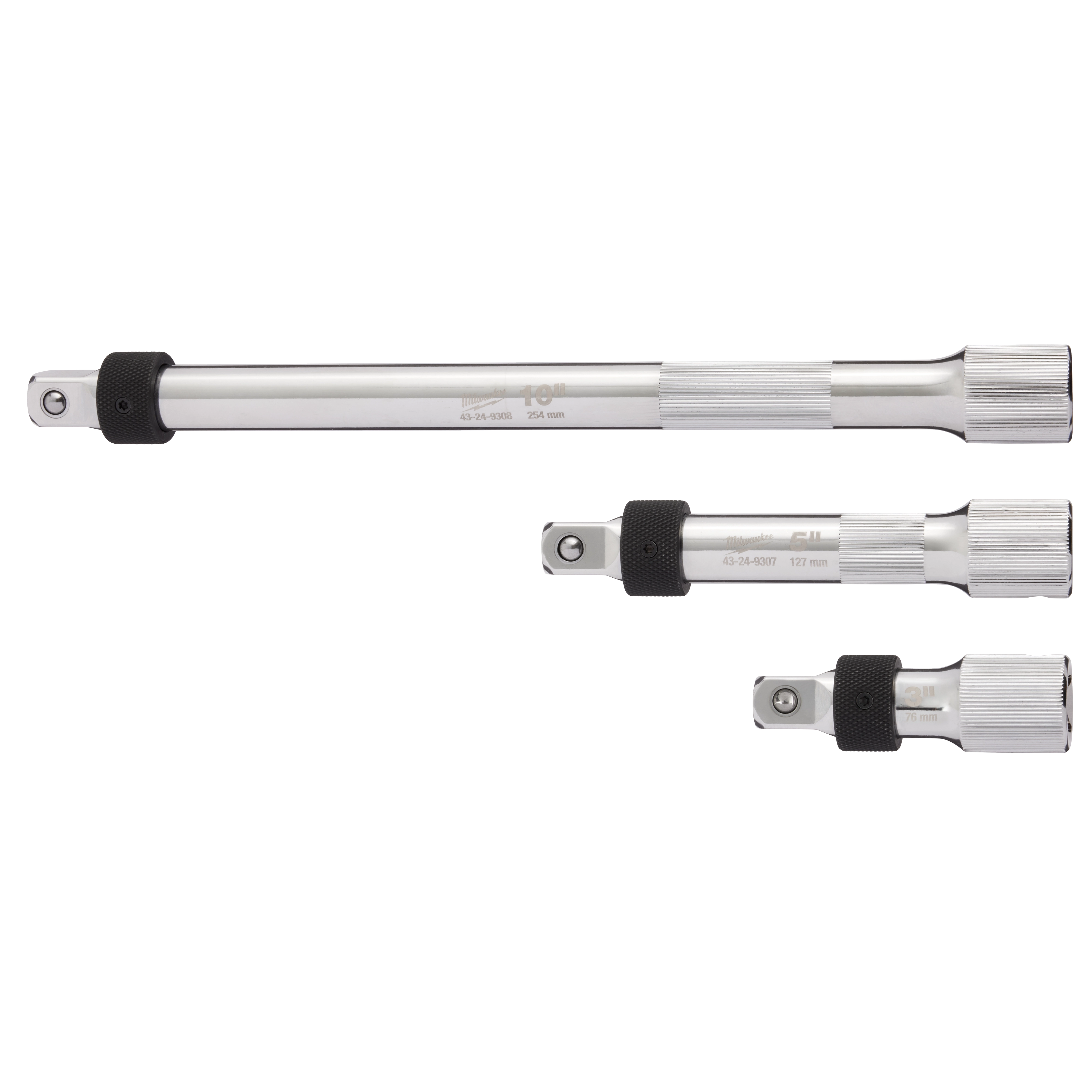 Our 3PC 1/2" Drive Locking Extension Set offers the most control and is more secure in tight applications. These extensions feature the largest knurling surface on both the shaft and female drive end allowing precision control when hand-tightening fasteners or working with oily materials. In addition to keeping the socket secure with a durable knurled locking collar, these extensions feature a detent hole to increase engagement with the ratchet head for better overall retention. The set includes a durable compact storage rack designed to optimize drawer space for long-term use. The chrome plating on the extensions offers corrosion and rust protection. All Milwaukee® Mechanics Hand Tools are backed by a lifetime guarantee.