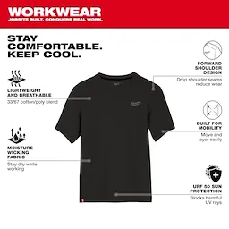 Our Short Sleeve Hybrid Work Tee is a lightweight and breathable solution that allows you to STAY COMFORTABLE and KEEP COOL. This work t-shirt is specifically created for mobility and durability with its drop shoulder design to reduce wear on the seams. The MILWAUKEE® Hybrid Work Tee Shirts are built to protect against the elements, offering UPF 50 protection for those warm days on the jobsite and moisture-wicking fabric so you can stay dry while working. Choose from a variety of colors, including black, blue, gray, and green, available in sizes small to 3XL.