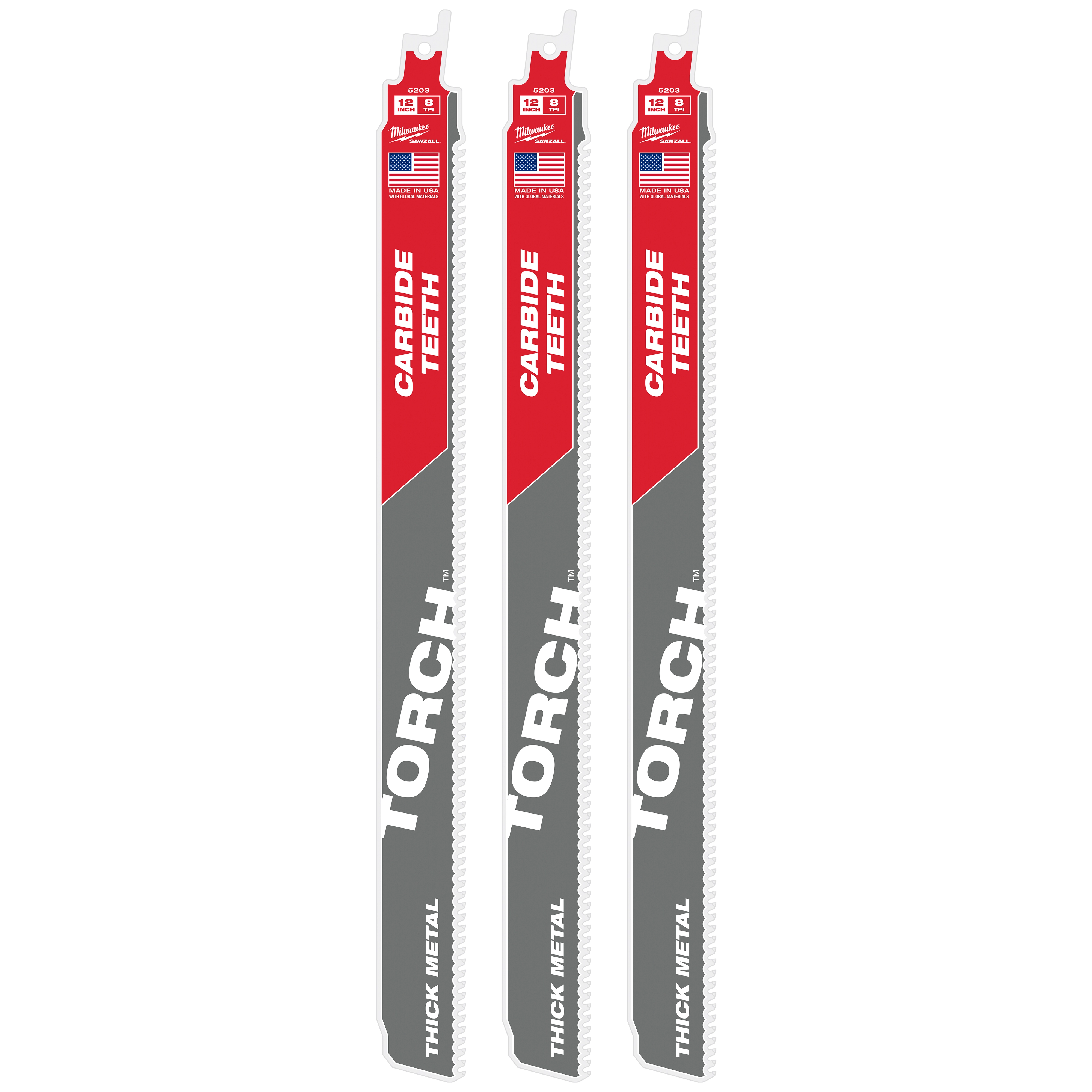 Our TORCH™ with Carbide Teeth SAWZALL® Blades have been engineered to deliver extreme life and unmatched versatility in thick and extreme metal cutting applications. This reciprocating saw blade delivers up to 50X life over standard blades. The TORCH™ with Carbide Teeth tackles a wide variety of metal materials ranging from black pipe and angle iron to cast iron, stainless steel, and high strength alloys. With up to 70% larger gullets than other carbide blades and an optimized tooth design, these blades deliver extreme life in metal cutting applications.