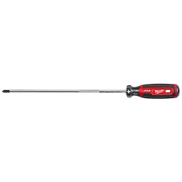 Our Milwaukee® Cushion Grip Screwdrivers (USA) are manufactured to give the professional the best-fitting screwdriver with max grip. Our screwdriver tips are custom machined to deliver a precise fit and reduce stripping during demanding fastening applications. For added confidence, the tips are laser etched to increase the gripping surface. Manufactured with high-strength boron-infused steel for increased hardness, our screwdrivers stand up to the demands of the site with ultimate durability and life. Providing increased versatility, select screwdrivers include a wrench-ready bolster for added torque and a knurled shank for precision control. Quick identification markings on the handle make it easy to identify screwdriver tip size and type, including Phillips, cabinet, ECX, slotted, and square. The demolition screwdrivers also include a hammer-ready strike cap. Our screwdrivers range in shank sizes from 3-inch to 10-inch. Our Milwaukee Cushion Grip Screwdrivers (USA) are made in the USA with best-in-class manufacturing technology and USA-sourced materials all backed by a complete Lifetime Guarantee.