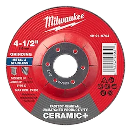 Our Ceramic+ metal grinding wheels are designed to deliver the fastest material removal and unmatched productivity in metal and stainless steel applications. The Ceramic+ line of wheels is equipped with self-sharpening, shaped ceramic grain, resulting in 2X faster material removal – increasing your overall productivity on the job. Our shaped ceramic grain will continuously form new, sharp peaks within the grains to maintain performance and result in less effort required to complete your application – saving time and energy. The innovative bonding process and wheel formula are optimized for uniform grain release throughout the wheel's lifespan, resulting in a longer-lasting performance than competitive ceramic wheels. These Ceramic+ grinding wheels deliver cleaner finishes and help reduce vibration while grinding. Manufactured with 3 full sheets of high-strength fiberglass reinforcement and a uniform grain concentration, these wheels are engineered for durability. Our grinding wheels offer exceptional versatility to grind carbon steel, stainless, and nickel-based alloys in materials like steel, angle iron, pipe, rebar, and other ferrous metals.