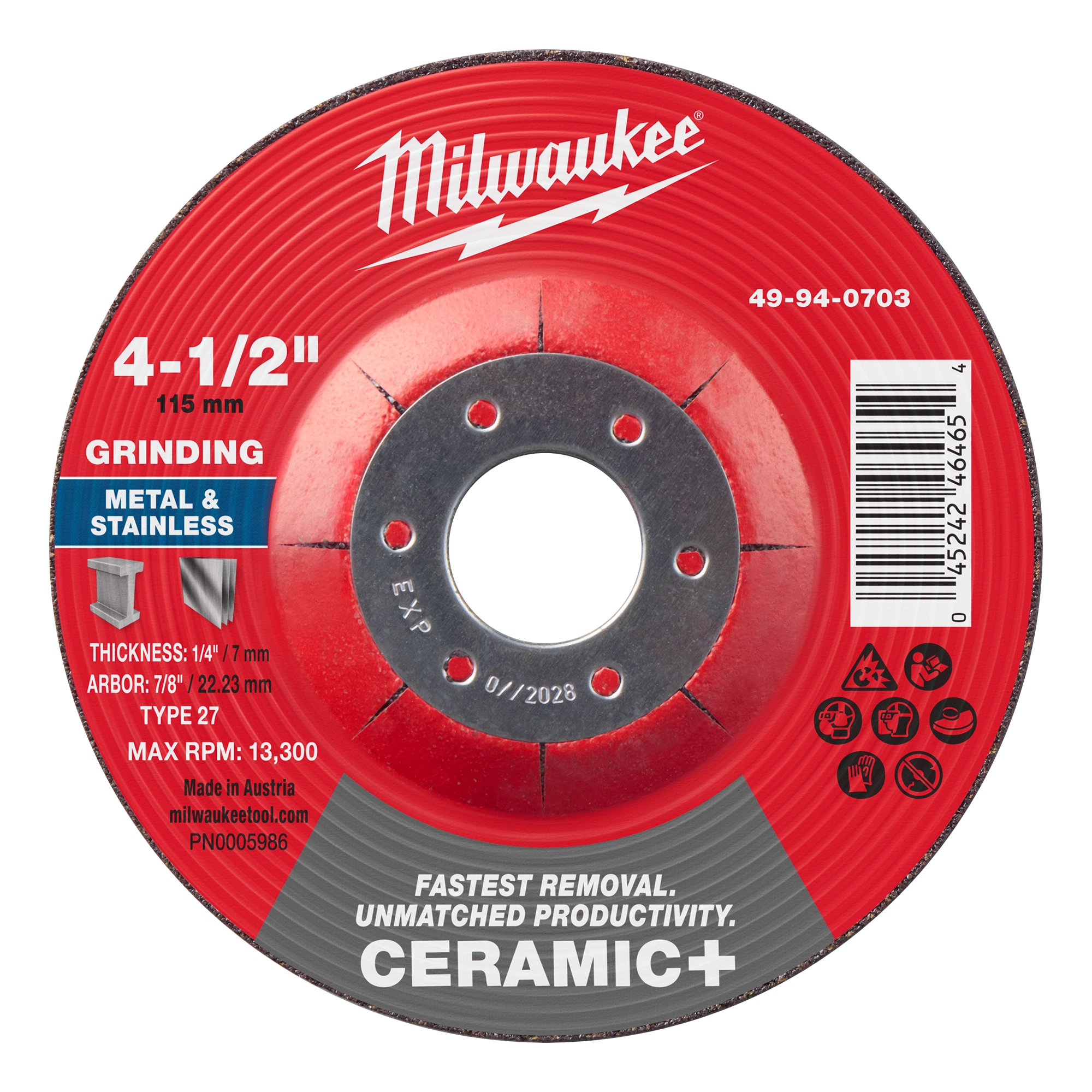 4-1/2" x 1/4" x 7/8" Ceramic+ Metal Grinding Wheel - Type 27