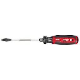 Our Milwaukee® Cushion Grip Screwdrivers (USA) are manufactured to give the professional the best-fitting screwdriver with max grip. Our screwdriver tips are custom machined to deliver a precise fit and reduce stripping during demanding fastening applications. For added confidence, the tips are laser etched to increase the gripping surface. Manufactured with high-strength boron-infused steel for increased hardness, our screwdrivers stand up to the demands of the site with ultimate durability and life. Providing increased versatility, select screwdrivers include a wrench-ready bolster for added torque and a knurled shank for precision control. Quick identification markings on the handle make it easy to identify screwdriver tip size and type, including Phillips, cabinet, ECX, slotted, and square. The demolition screwdrivers also include a hammer-ready strike cap. Our screwdrivers range in shank sizes from 3-inch to 10-inch. Our Milwaukee Cushion Grip Screwdrivers (USA) are made in the USA with best-in-class manufacturing technology and USA-sourced materials all backed by a complete Lifetime Guarantee.