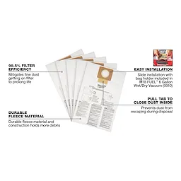 Our Fleece Dust Bags (5PK) are compatible with MILWAUKEE® M18 FUEL™ NEXUS™ 6 Gallon Wet/Dry Vacuums (0910, 0914, 0915). With a 98.5% filter efficiency, these disposable fleece dust bags are ideal for collecting fine dust. The vacuum cleaner dust bags are fully enclosed and act as a pre-filter to prolong filter life, making them easy to dispose of with the pull tab, which prevents dust from escaping. This kit includes five Fleece Dust Bags.