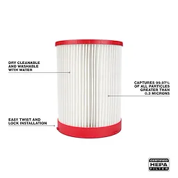 Our Large Wet/Dry Vacuum HEPA Filter is compatible with Milwaukee NEXUS™ Wet/Dry Vacuums (0910, 0914, 0915, 0920, 0926, 0930, 0931). An installed HEPA Filter captures 99.97% of all particles greater than 0.3 microns for fine dust collection, ensuring the collection of debris such as concrete dust, sawdust, and drywall dust. You can quickly swap or clean filters with the easy-access quarter-turn design. The MILWAUKEE® Large Wet/Dry Vacuum HEPA Filter is dry cleanable and washable with water when necessary. This product contains (1) HEPA Filter.