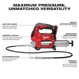 Our M18 FUEL™ ½” HTIW w/ Friction Ring & Grease Gun Combo Kit includes the most power-dense impact wrench in its class, provides greater access in tight spaces, and maximizes productivity through faster removal speeds. The POWERSTATE™ Brushless Motor delivers up to 1,100 ft-lbs of Fastening Torque and 1,500 ft-lbs of Nut-Busting Torque when paired with our M18™ REDLITHIUM™ XC5.0 Battery, while the compact size at 7.6" in length gives users greater access in tight spaces. The M18 FUEL™ ½” High Torque Impact Wrench w/ Friction Ring maximizes productivity on the jobsite and in the shop by removing stubborn bolts and fasteners faster than cordless competitors. Our patented battery isolation system provides a secure battery connection and controls vibration transmitted to the pack. Tri-LEDs surround the anvil to deliver brighter light with fewer shadows. 4-Mode DRIVE CONTROL™ offers greater precision with a range of pre-set RPM and IPM levels, selectable from a single button on the tool. By selecting Mode 4, AUTO SHUT-OFF™ control applies no more than 50 ft-lbs of torque for hand-tight fastening applications to prevent overtightening. Mode 4 also features Bolt Removal Control that delivers our users full torque output, then decreases RPMs once the bolt is loosened to prevent fastener drops. The ½” Friction Ring design allows for quick & tool-free socket changes. The M18™ REDLITHIUM™ XC5.0 Resistant Battery included provides increased protection against oils, greases, & solvents.